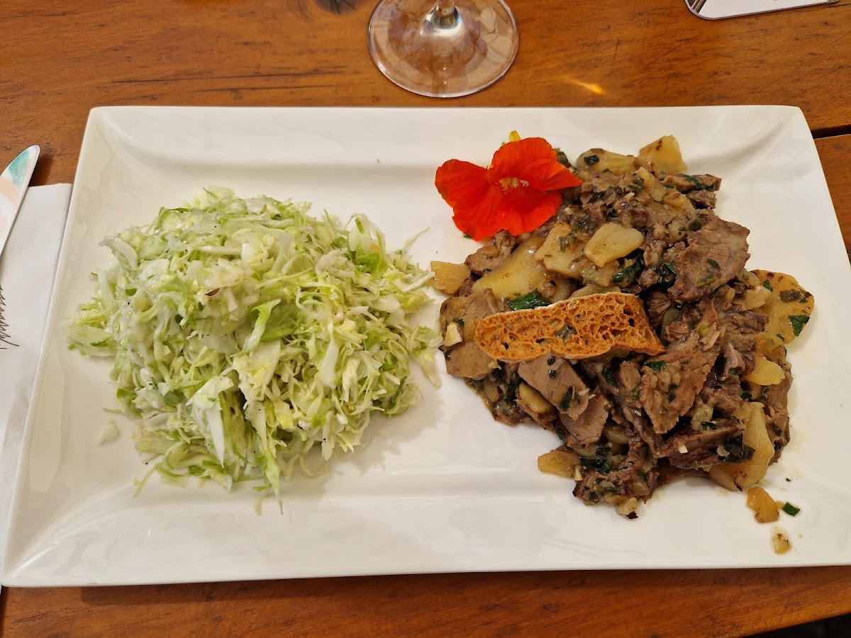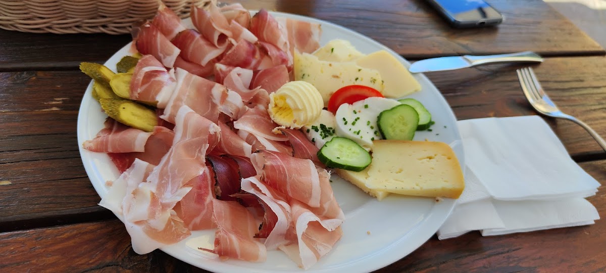 Another dish worth mentioning is the Grostl, a flavorful combination of roasted meat, potatoes, and vegetables, perfect for satisfying your hunger after a day of sightseeing. If you're in the mood for a lighter bite, the Aufschnitt Schinken Käse (a platter of cured meats and cheeses) offers a delicious way to sample some of the region's best produce. And for those looking for a comforting soup, the Speckknödelsuppe delivers a flavorful broth with dumplings made from speck, a local type of cured ham, perfect for warming you up on cooler days.